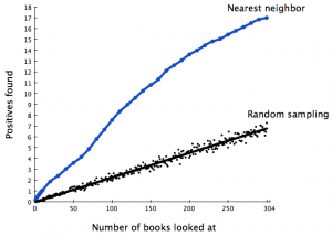 The books sampled by choosing $k$ books near books on the shelf shows a substantially higher incidence of drawing another book from the shelf. This suggests that, at least for our test shelf, the concept represented by our shelf does form a cluster in our feature space.